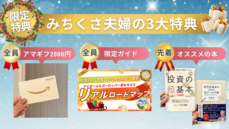 さらに、みちくさ夫婦から『結婚5年で資産2000万円を達成するまでにやったこと』をまとめた資料をプレゼントします!