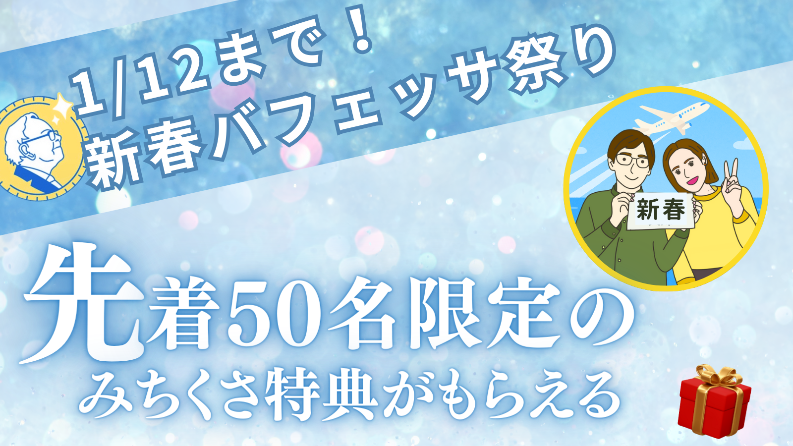 >>ここをタップして、今すぐ『みちくさ夫婦限定特典』のもらい方を確認する! >>ここをタップして、今すぐ『バフェッサ祭り』の詳細を確認する! 今回のバフェッサ祭りは、2026年に向けて注目銘柄5つが知れるチャンス🎁みちくさ夫婦からの豪華... -