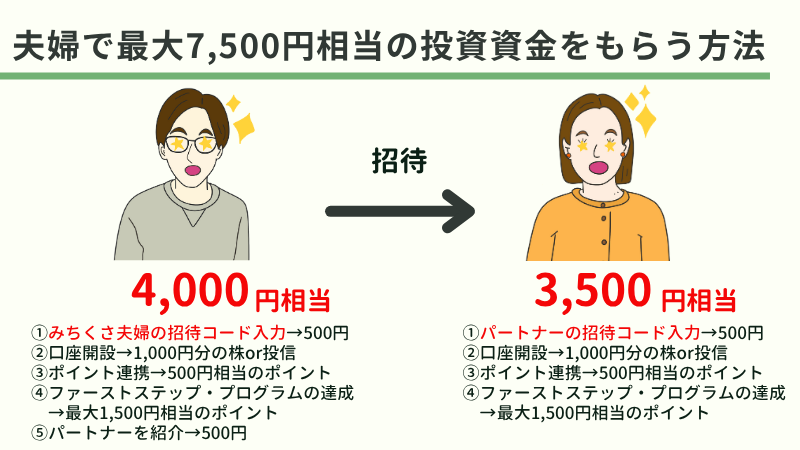 さらに、夫婦で口座開設をすれば、最大で7,500円相当の投資資金がもらえます!